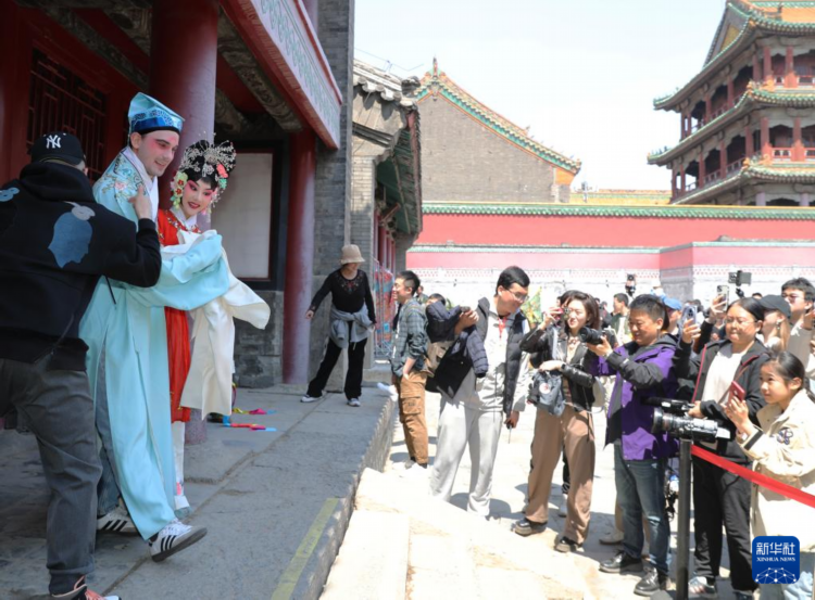 2024年4月30日,在沈阳故宫,来自俄罗斯的芭蕾舞演员与沈阳京剧院的演员互动。