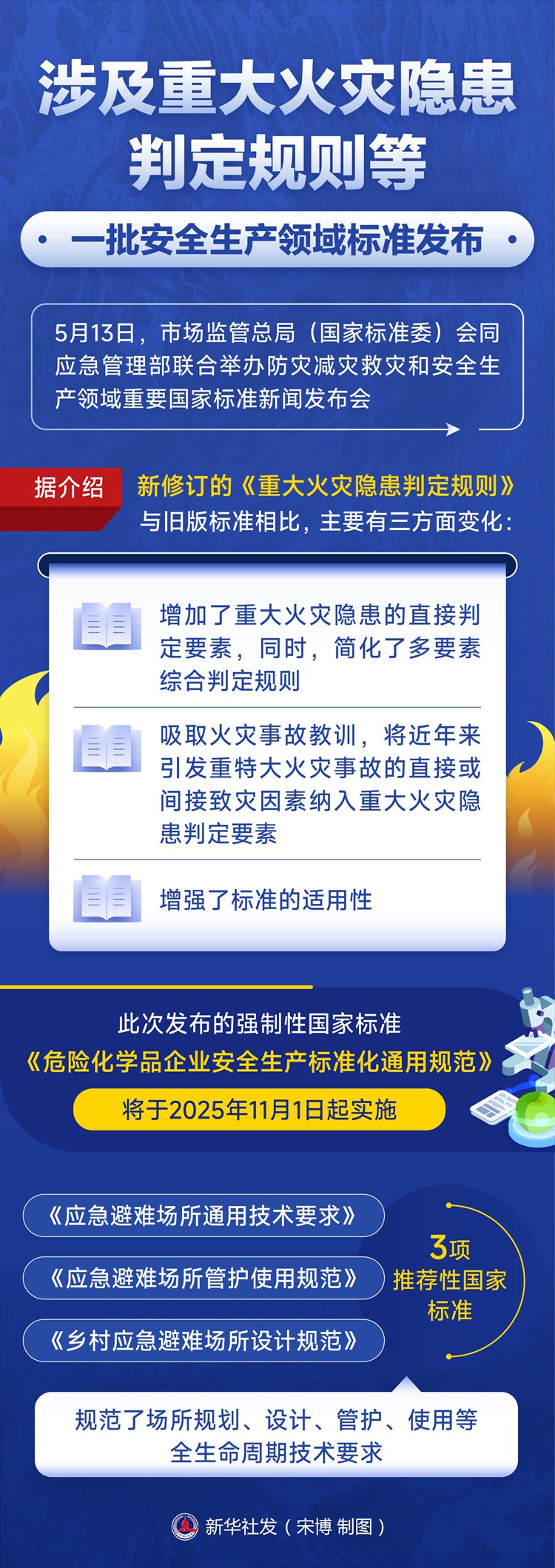 新华社北京5月13日电 题:涉及重大火灾隐患判定规则等 一批安全生产领域标准发布