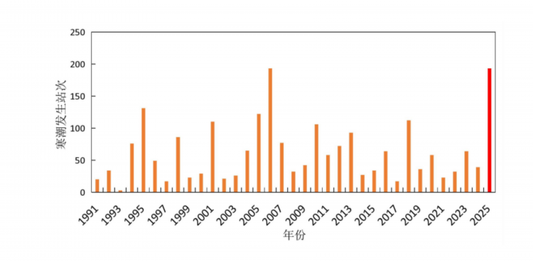 甘肃省气象局统计的1991-2025年的3月1日至4月13日寒潮逐年变化柱状图。