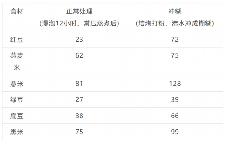 从以下表格可以看到,粗粮打粉后GI普遍升高,有些食物直接从低GI变成高GI食物。