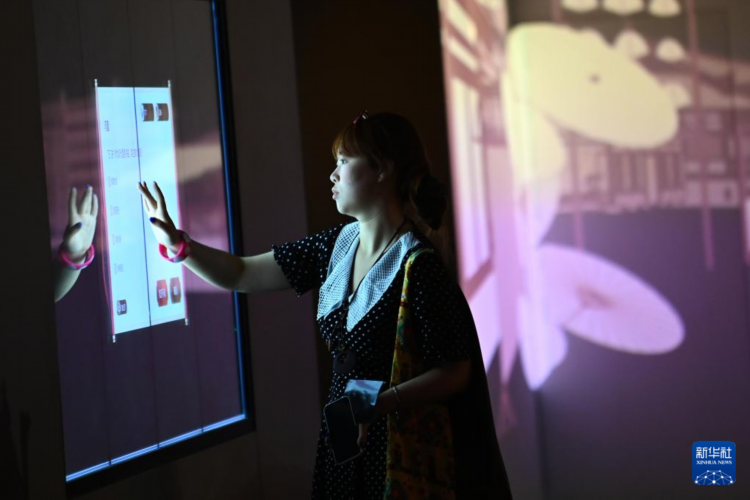 5月12日,游客在改扩建后的西安碑林博物馆北区场馆进行互动体验。
