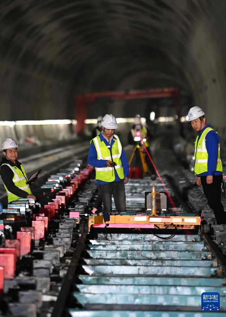 5月13日,在贯通的西康高铁秦岭九天山隧道内,施工技术人员在无砟轨道作业现场采集精调数据。