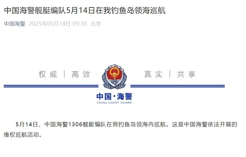 5月14日,中国海警1306舰艇编队在我钓鱼岛领海内巡航。这是中国海警依法开展的维权巡航活动。