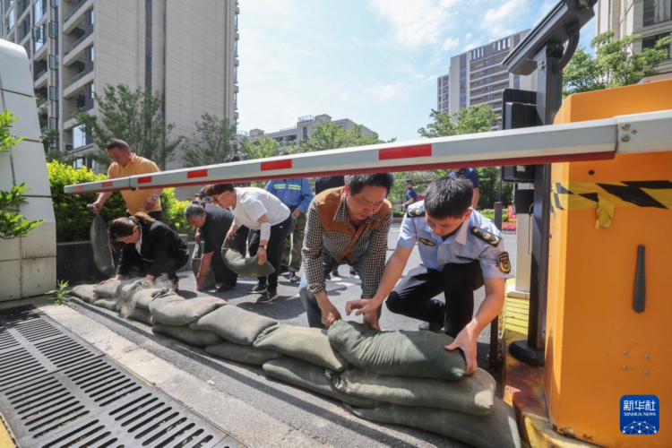 5月14日,道场乡应急消防管理站工作人员和消防队员指导湖山府社区物业工作人员开展防汛沙袋堆砌和排水设备操作。