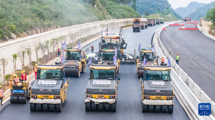无人驾驶的压路机在贵平高速者密至四寨路段进行施工(5月14日摄,无人机照片)。