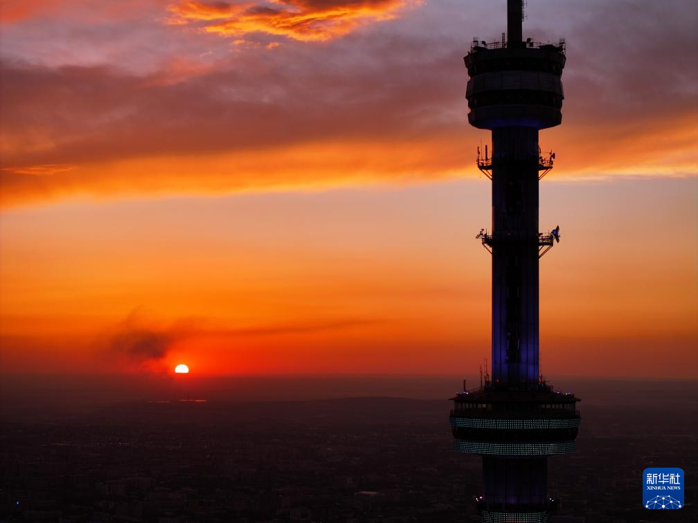这是5月13日在哈萨克斯坦阿拉木图拍摄的日落时分的科克托别电视塔(无人机照片)。