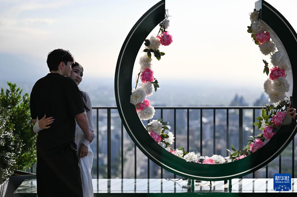 5月13日,一对情侣在哈萨克斯坦阿拉木图的科克托别山拍照留念。