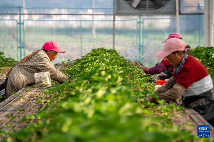 5月15日,工人在巧家县马树镇草莓种植基地育苗。