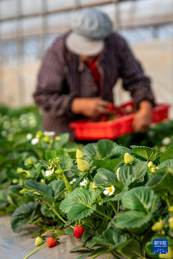 5月15日,工人在巧家县马树镇草莓种植基地采摘草莓。
