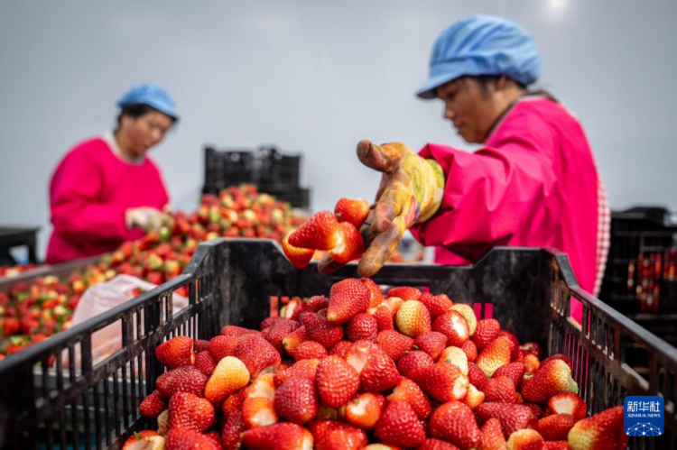5月15日,在巧家县马树镇草莓深加工厂,工人把去蒂后的草莓放入收集框。