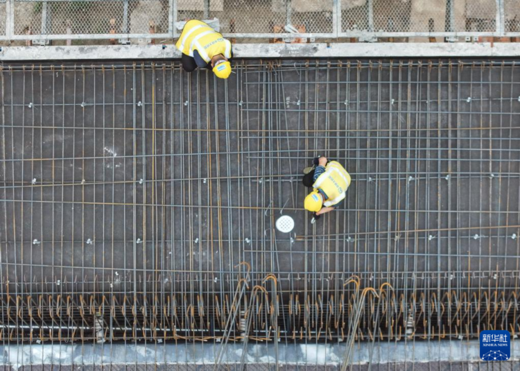5月15日,中铁大桥局施工人员在崇启公铁长江大桥建设现场绑扎钢筋(无人机照片)。