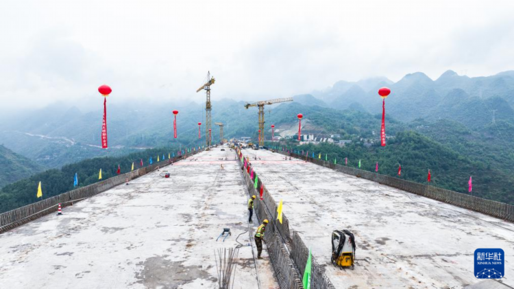 5月15日,工人在纳晴高速六枝特大桥上进行施工(无人机照片)。