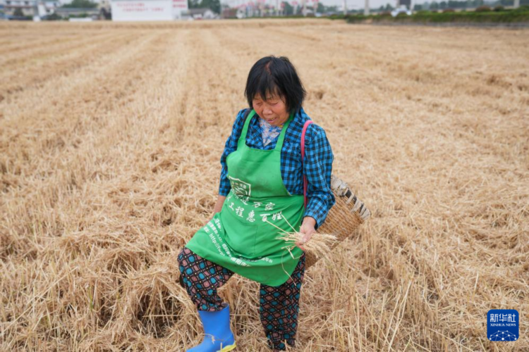 5月15日,当地群众在广汉市连山镇万亩小麦高产示范片麦田里捡麦穗。