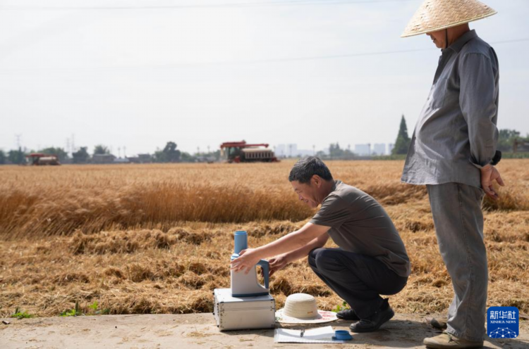 5月15日,工作人员在广汉市南丰镇双福村测量刚收获小麦的水分。