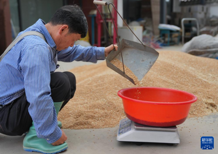 5月15日,在广汉市连山镇万亩小麦高产示范片,工作人员对刚收获的小麦进行称重。