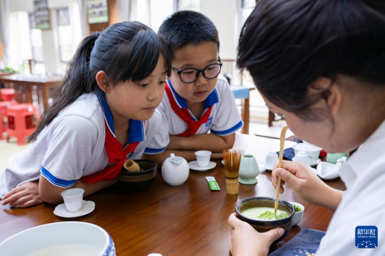 5月14日,学生在贵州省江口县贵茶产业园茶室参加研学,观看抹茶茶饮制作。