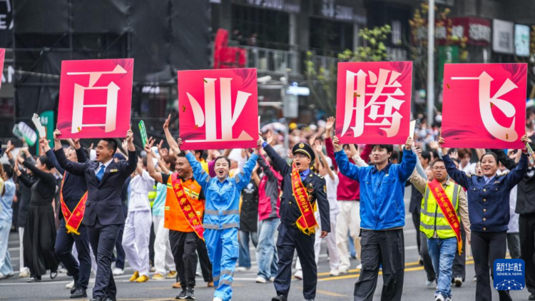 5月18日,奋斗之光方阵的表演队伍在进行巡游。
