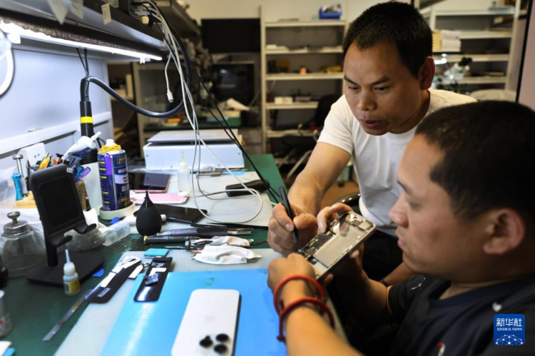 5月17日,柯水昌(后)在工位上指导学员手机维修技巧。