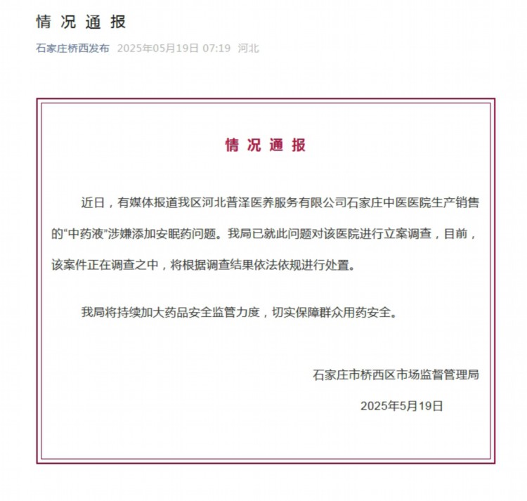 近日,有媒体报道桥西区河北普泽医养服务有限公司石家庄中医医院生产销售的“中药液”涉嫌添加安眠药问题。石家庄市桥西区市场监督管理局已就此问题对该医院进行立案调查,目前,该案件正在调查之中,将根据调查结果依法依规进行处置。