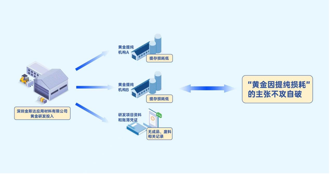 前期,深圳市税务局稽查局通过税收大数据分析发现,深圳金斯达应用材料有限公司研发投入巨大,远超同行业正常水平。对此疑点线索,检查人员比对了企业申报数据、财务资料、进销存数据等,发现该公司在检查所属期内“研发费用——直接材料”科目中有列支金额8000余万元的黄金投入,既没有对应的成品产出,也没有相应的废料回收等记录。