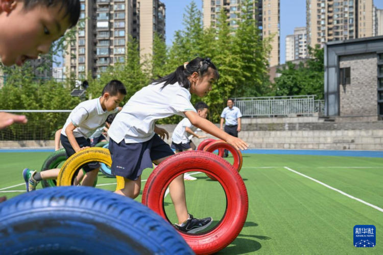 5月19日,重庆市渝中区天地人和街小学,同学们参加滚轮胎大课间活动。