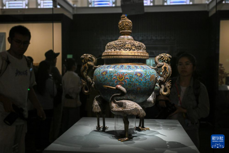 这是展出的清代掐丝珐琅鹤足炉(5月19日摄)。