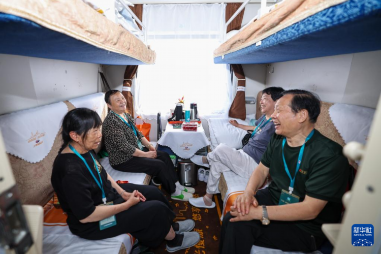 5月19日,乘坐Y476/7次“长三角号”援疆银发旅游专列的旅客在车厢内聊天。