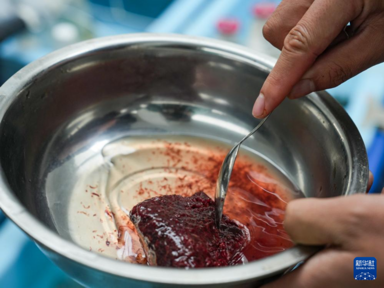 5月18日,科研人员将冻饵料解冻。