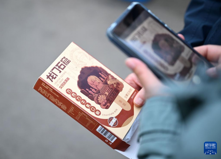 4月24日,游客为购买的龙门石窟文创冰淇淋拍照留念。