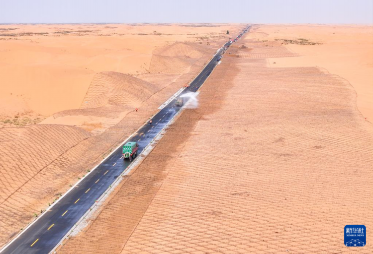 近日,内蒙古鄂尔多斯市达拉特旗境内的巴蒲线实现全线贯通。这条崭新的柏油公路横亘在库布其沙漠腹地,道路两边,工人们有序推进治沙工程作业,切割沙柳条、栽植立式网格沙障,工程机械推平沙丘,以备光伏装机。
