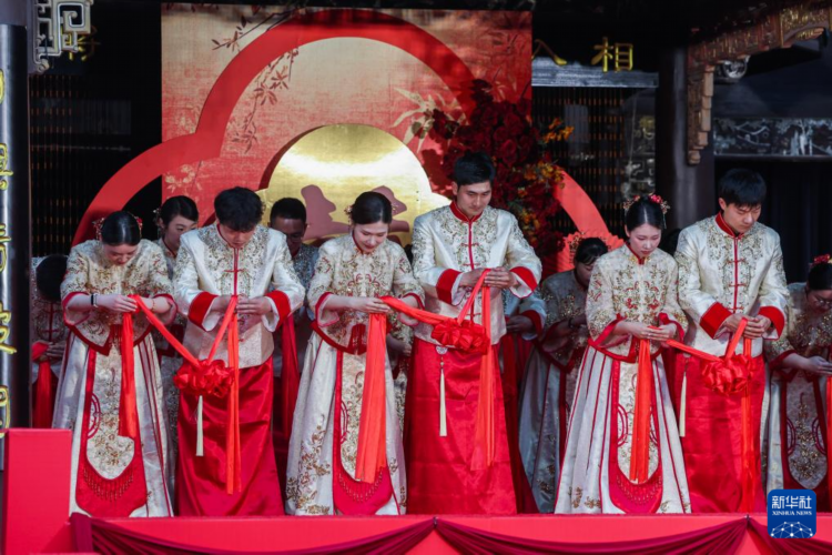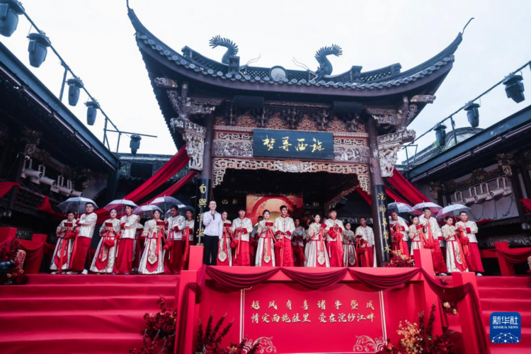 当日,18对新人在浙江省诸暨市西施故里景区内参加以“越风有喜·诸事暨成——情定西施故里 爱在浣纱江畔”为主题的集体婚礼。本次集体婚礼旨在倡导文明简约的婚嫁理念,通过精心设计的集体婚礼仪式,为新人打造既庄重又温馨的婚礼体验,既减轻经济负担、又传承美好家风,倡导婚俗改革文明新风尚。