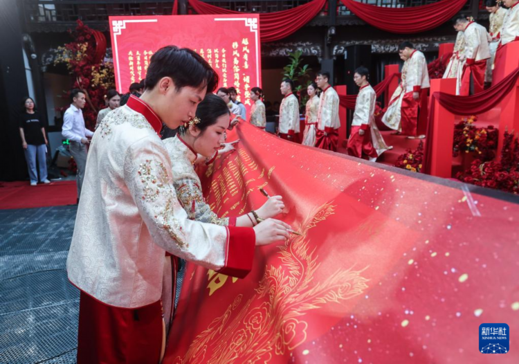 5月20日,参加集体婚礼仪式的新人们签订移风易俗简婚承诺。