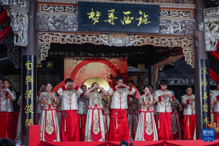 5月20日,新人们在诸暨市西施故里景区内参加集体婚礼的合卺礼仪式。