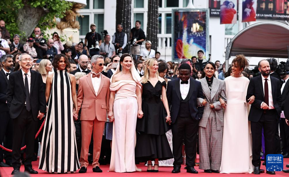 5月13日,在法国戛纳举行的第78届戛纳国际电影节上,主竞赛单元评委会主席朱丽叶·比诺什(前排左四)携众评委亮相开幕式红毯。