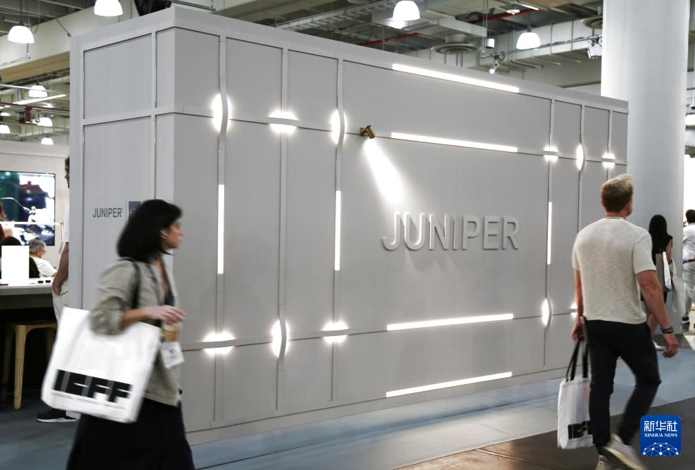 5月18日,在美国纽约举行的2025年国际当代家具展现场,参展人员走过美国灯饰设计和制造企业朱尼珀设计集团公司的展区。新华社记者 刘亚南 摄