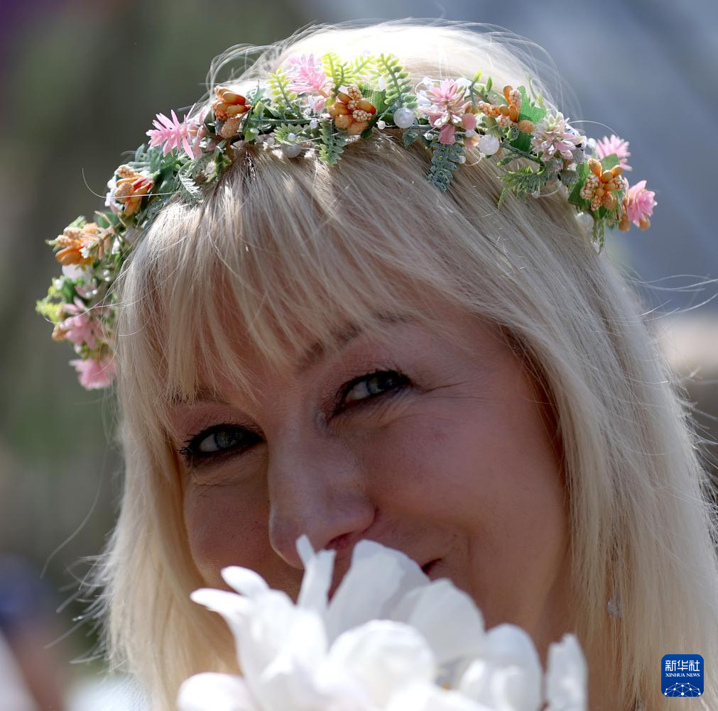 5月20日,一名戴着花饰的女子在英国伦敦参加切尔西花展。