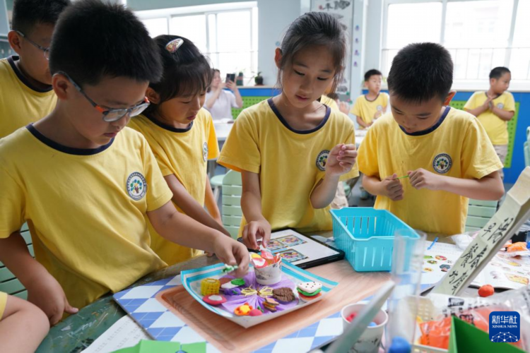 5月21日,北京教育科学研究院丰台实验小学一年级学生在美术课上制作“爱心早餐”。