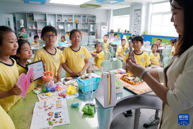 5月21日,北京教育科学研究院丰台实验小学一年级学生在上美术课,教师通过手机直播实时分享给家长。