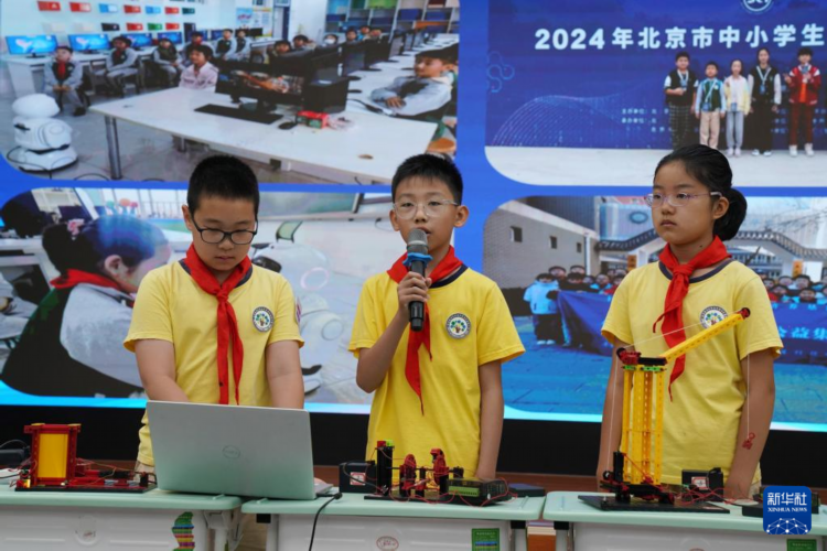 5月21日,北京教育科学研究院丰台实验小学人工智能社团学生介绍自己制作的创意作品。