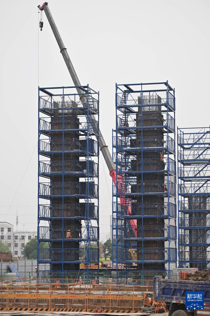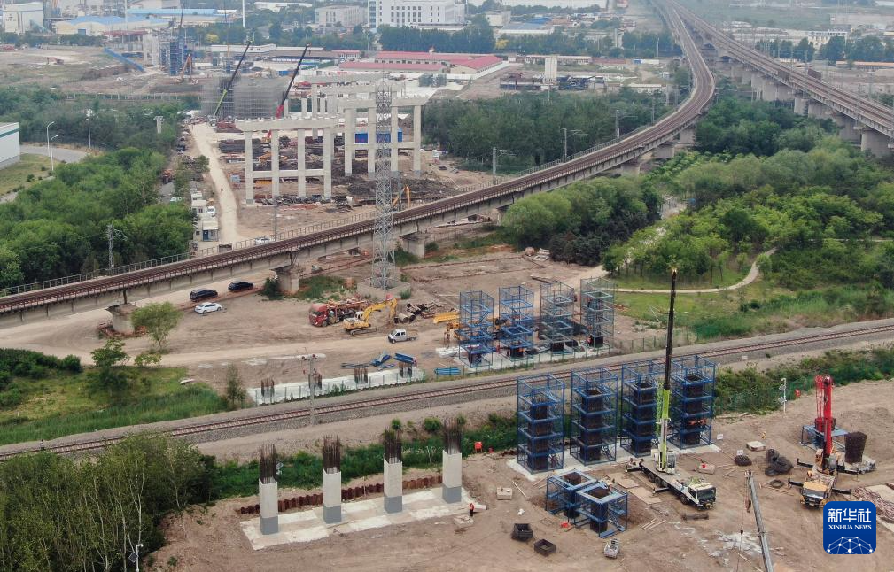 这是天津港集疏运专用货运通道工程第2标段项目施工现场一景(5月22日摄,无人机照片)。