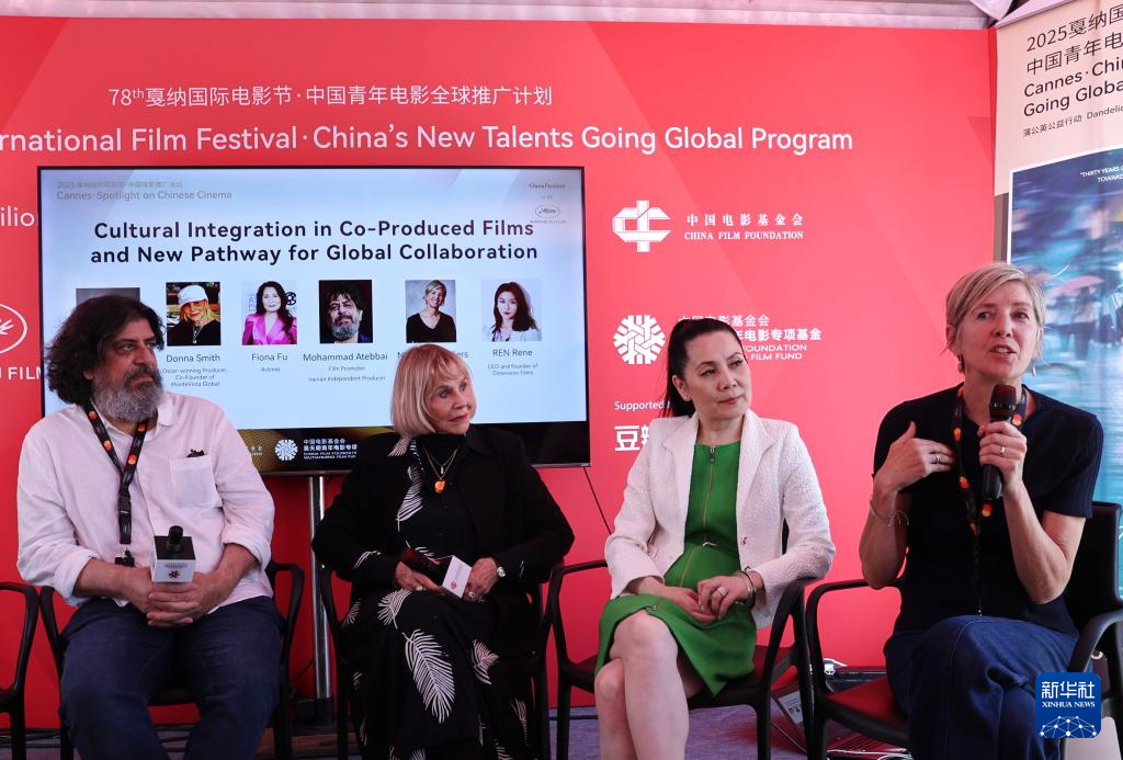 5月17日,在法国戛纳,资深制片人娜塔莎·德维莱尔(右一)在一场由中国电影基金会吴天明青年电影专项基金举办的合拍片主题交流会上发言。新华社记者 张百慧 摄