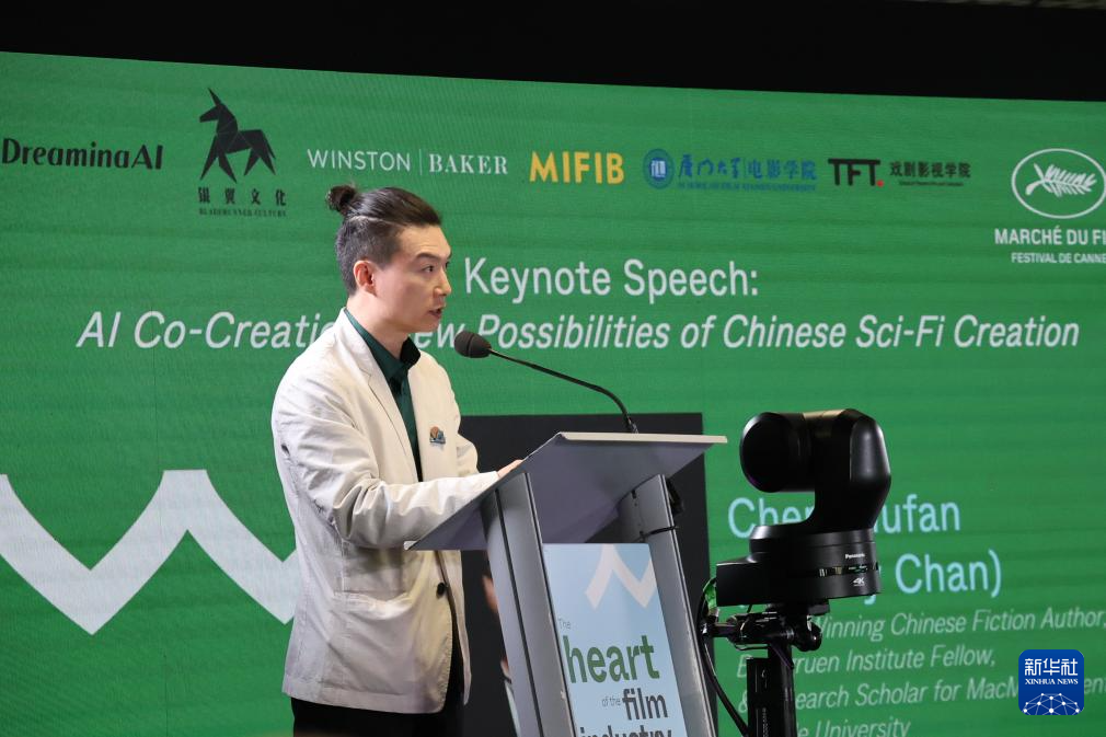5月19日,中国科幻作家陈楸帆在法国戛纳一场有关人工智能在叙事领域的应用潜力论坛上发言。新华社记者 张百慧 摄