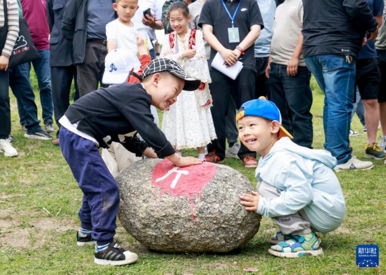 5月24日,在新疆阿勒泰市汗德尕特蒙古族乡,两名小游客在抱石头比赛间隙尝试推动巨石。