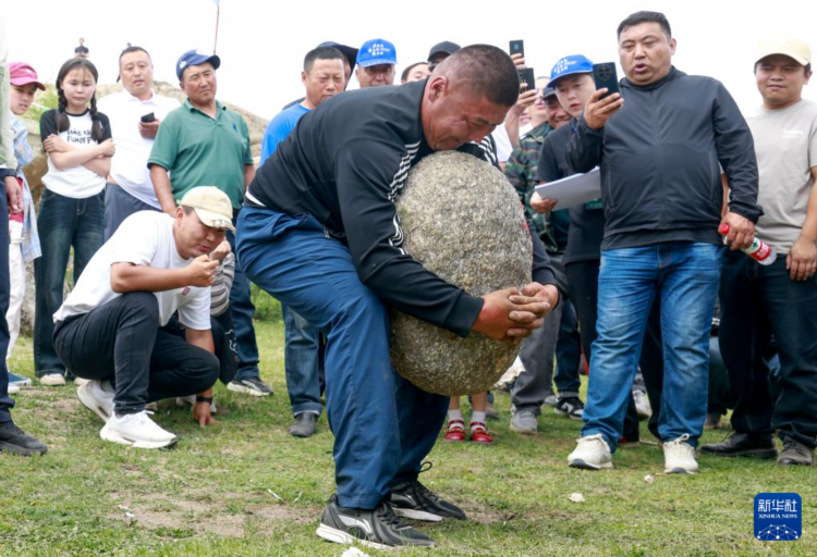 5月24日,在新疆阿勒泰市汗德尕特蒙古族乡,选手在参加抱石头比赛。