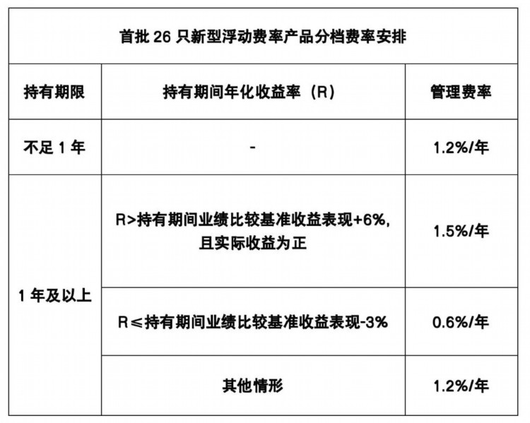 首批产品均设置了1.2%(基准档)、1.5%(升档)、0.6%(降档)三档费率水平。投资者持有一年以后赎回产品时,基金管理人将会根据产品年化收益水平与业绩比较基准的对比情况,来计提不同档次的管理费。