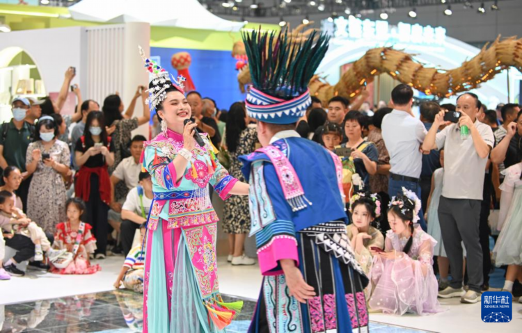 5月23日,观众在文博会现场选购第十五届全运会特许商品。
