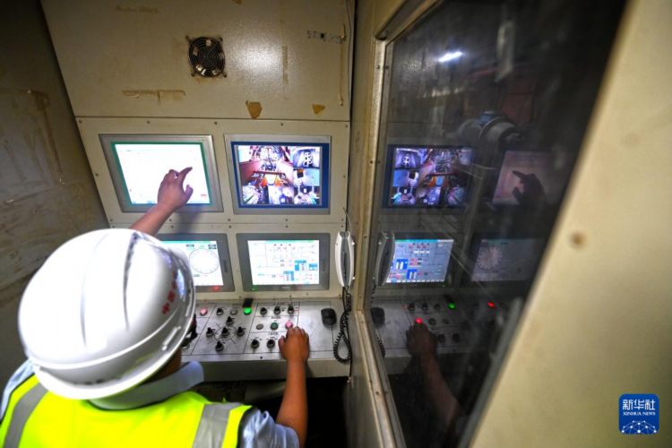 5月26日,施工人员在“青年先锋号”盾构机操作室检查设备运行情况。