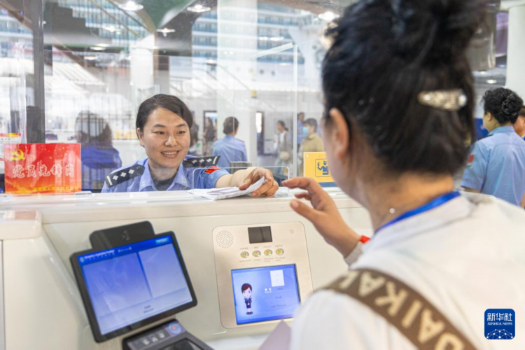 5月27日,大连港国际邮轮中心边检民警为登轮游客办理出境手续。