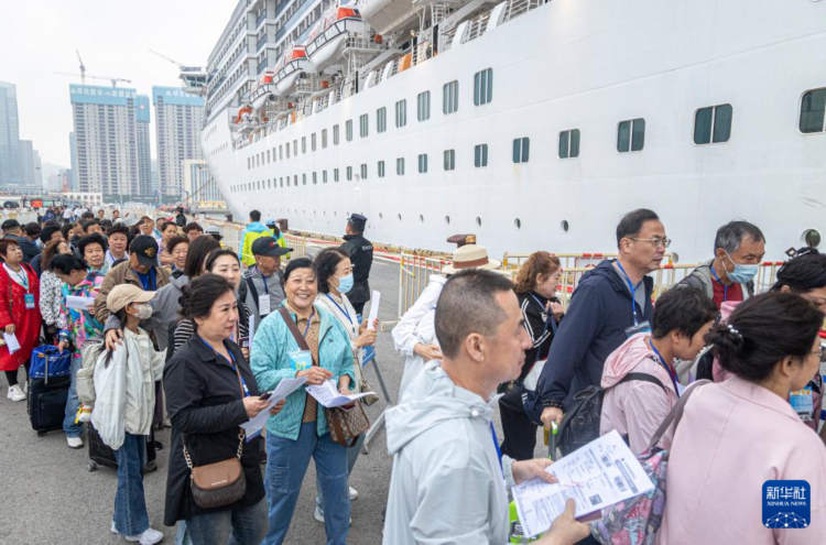 5月27日,游客在大连港国际邮轮中心准备登上“爱达·地中海”号。