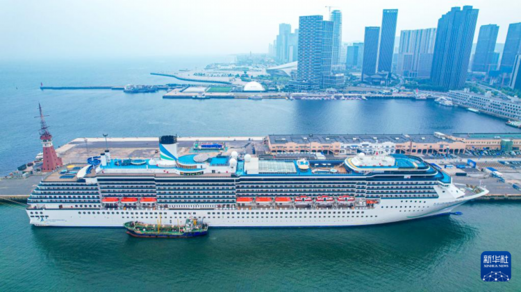 5月27日拍摄的停靠在大连港国际邮轮中心泊位的“爱达·地中海”号(无人机照片)。